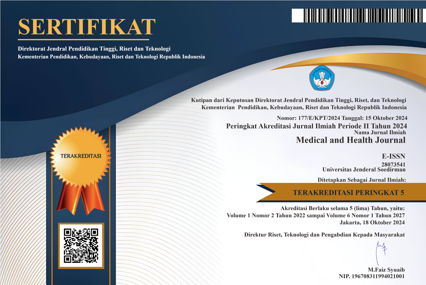 Medical and Health Journal has been nationally accredited by the Ministry of Research and Technology/National Research and Innovation Agency of the Republic of Indonesia and is currently indexed in SINTA (Science and Technology Index) at SINTA 5 level.
