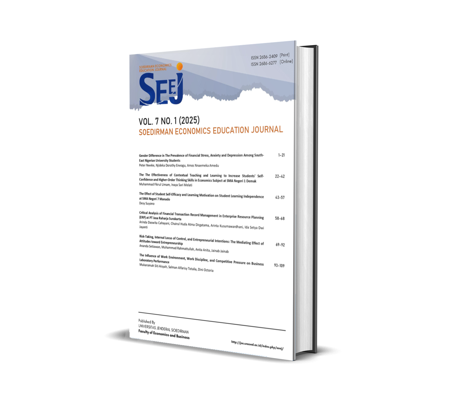 This issue has been available online since 19th May 2025 for the regular issue of May 2025. SEEJ Vol. 7, No. 1 (2025) presents international research (Indonesia, Nigeria, South Africa) focusing on economic, financial, and entrepreneurial education. Topics discussed include the effectiveness of Contextual Teaching and Learning in improving students' higher-order thinking skills (HOTS) and the influence of self-efficacy on learning independence. In the field of finance, this edition examines student financial stress in Nigeria and ERP management analysis at PT Jasa Raharja. The entrepreneurship theme explores the relationship between risk-taking and locus of control on entrepreneurial intent, as well as the impact of the work environment on business laboratory performance.